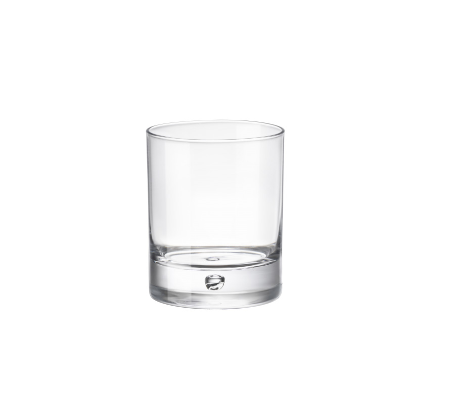 La sua base spessa, solida e ben proporzionata, è impreziosita da una caratteristica goccia interna, un dettaglio distintivo che cattura la luce e crea riflessi insoliti e suggestivi, aggiungendo personalità alla presentazione del bicchiere e delle bevande.